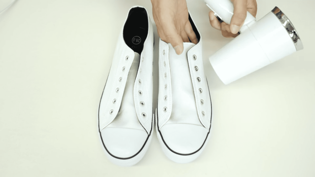 2. 30秒ほどドライヤーで温風を靴の生地全体に当てます。
