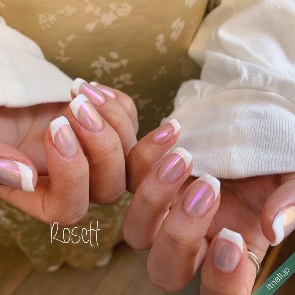 オーロラネイルをベースに、ホワイトカラーで描いたフレンチネイルは、シンプルですっきりしたネイルに仕上がります。初めての方でもチャレンジしやすい失敗知らずのデザインですよ♡ホワイトフレンチに飽きている方にもおすすめ!