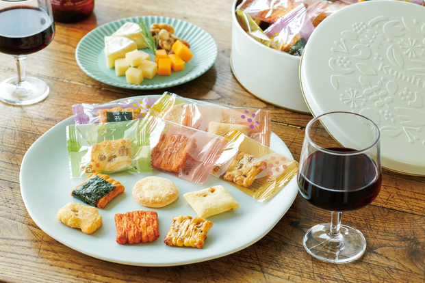 シナモンやドライフルーツなどを使用した、スイーツのような「ドライフルーツ&ナッツ」、チーズとピスタチオ、トマトの酸味がアクセントとなった「パルミジャーノレジャーノ」のセットで、ワインやカクテルなどのお酒にも合うというおかきです。