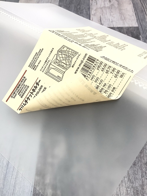 無印良品の「三ツ折りが簡単に作れるスリムチケットホルダー」 が便利!チケットやレシートはもちろん、A4の書類も簡単に三つ折りにして持ち歩けちゃいます。スリムなので、外出時に荷物がかさばらないのも嬉しい。