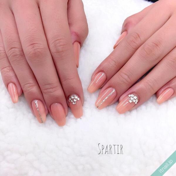 オレンジベージュのワンカラーネイルをベースに、ストーンを飾って華やかにするのもおすすめです。小さめのストーンを爪の根元側に置くと、上品で綺麗めな仕上がりになりますよ♪セルフネイルでもチャレンジしやすいですね。
