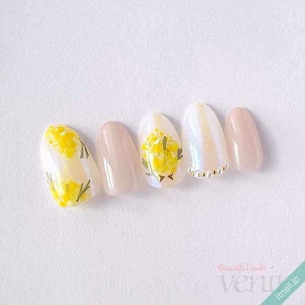 イエローのお花とオーロラに光る色味をポイントにして、上品な仕上がりに。春になるとお花のアートをしたくなりますが、付け替えのタイミングによっては桜やチューリップなど、どの種類にするか迷うこともありますよね。このお花は、時期に関係なくできるデザインです。