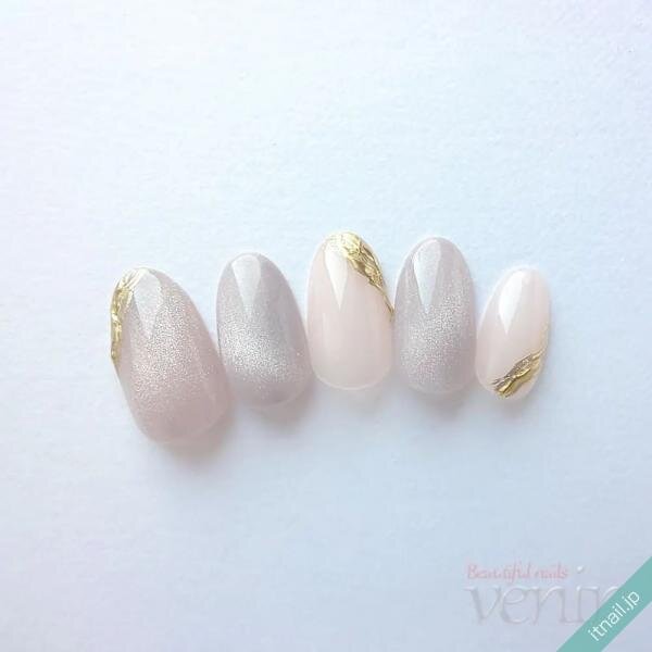 角度によって光り方が変わるグレージュ色のマグネットジェルと、爪のカーブに沿うようなゴールドラインで大人の女性らしさを演出。マグネットは、指を動かす度にキラキラと光って綺麗なので、手元を見るのが楽しくなってオススメ。ベビーピンク×ゴールドの組み合わせも可愛いですよね。