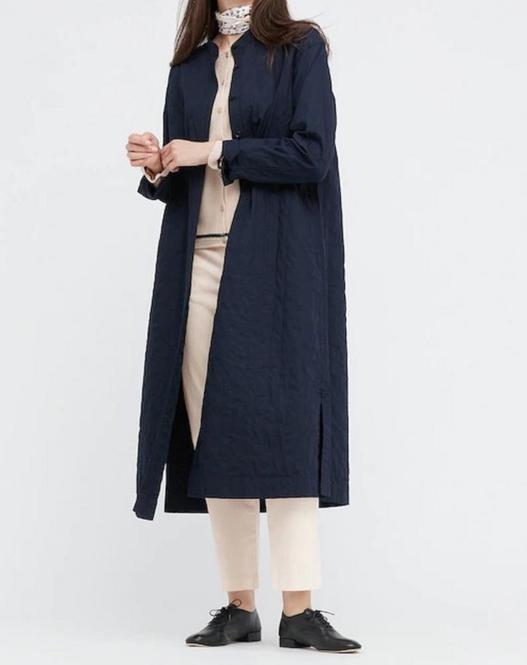 コットンを重ねて、ハリ感がありながらも柔らかい素材感のある1着です。クルーネックのような低めのスタンドカラーで、ロング丈になっているのが特徴。薄めなので、スプリングコートとしても、ワンピースとしても活躍しそう。