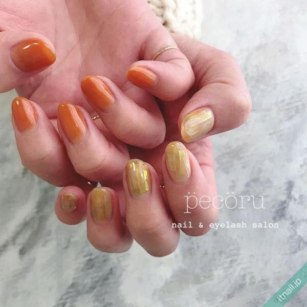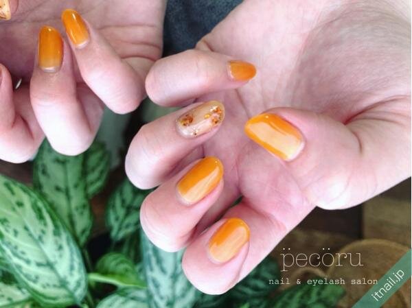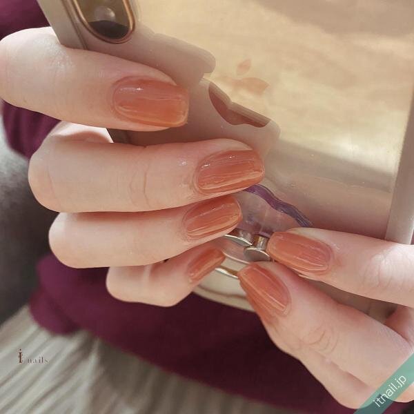 シンプル派さんにおすすめなのは、シアーなオレンジのみを使ったワンカラーネイルです。ダイレクトに透け感のあるオレンジが楽しめて、オンオフ問いません。春はちゅるんとした仕上がりが特に人気!