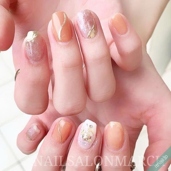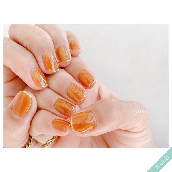 シアーなオレンジのワンカラーネイルに、ゴールドミラーをプラスしたデザインで、華やかさを楽しむのもおすすめです。細いフレンチラインなら、大人っぽく仕上がりますよ!濃いめのちゅるんとしたオレンジが、とってもジューシーですね。