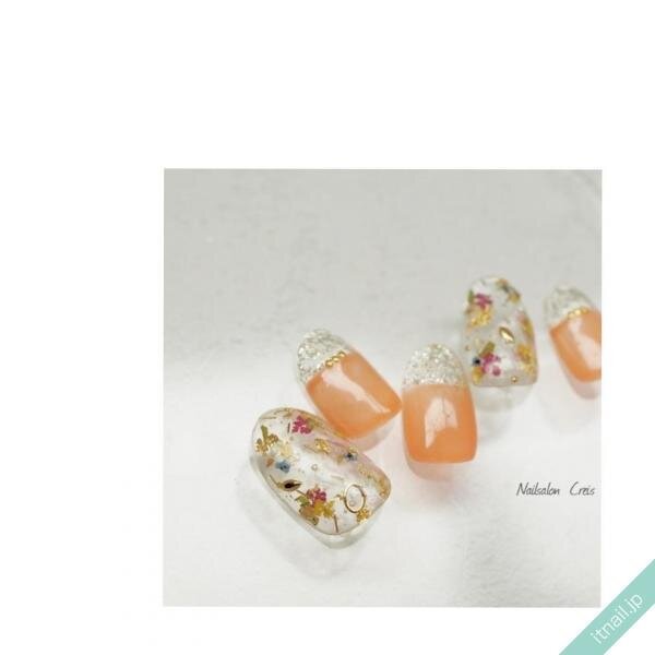 春は定番のフラワーネイルもおすすめ♪シアーなオレンジが、指先をパッと明るく見せてくれますし、押し花の可愛らしさにもマッチしてくれます。フレンチネイルにして、爽やかにするのもおすすめです。