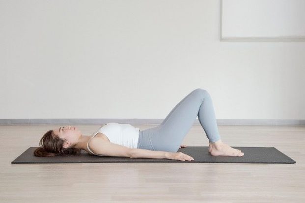 (1)床に仰向けになってひざを立てて両脚を腰幅程度に広げ、息を吸いながら骨盤を後傾させていき、骨盤を床にぴったりとくっつける