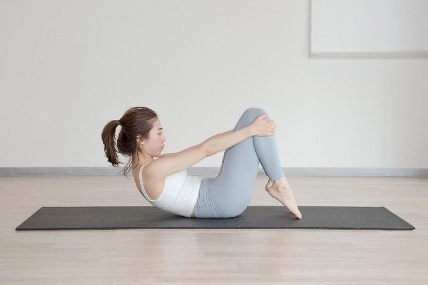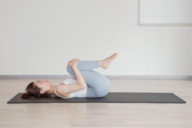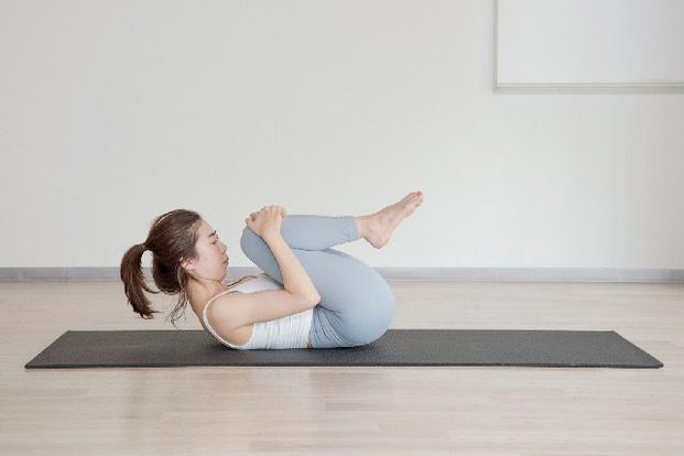 (2)両ひざを持ち上げ、息を吸いながら両手でひざを抱えて胸に近づけていく