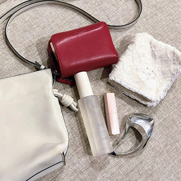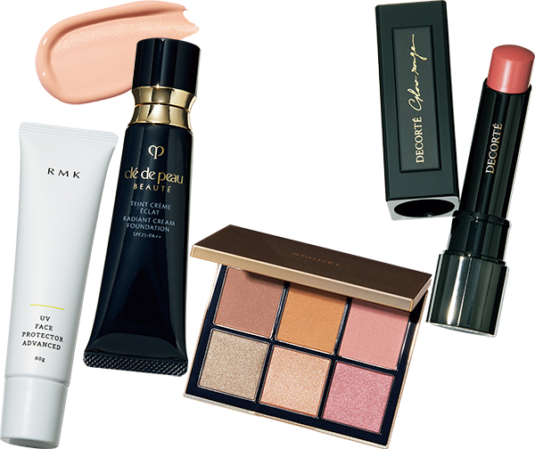 撮影現場でメークさんやライターさんにいいものを聞いたら試し、常にコスメはアップデート。ナチュラルに仕上がるように、パーツメークは肌なじみのいいものが多いです。左から・肌を守り抜くスキンケア発想のUVクリーム。 UVフェイスプロテクター アドバンスド SPF50+・PA++++ ¥3,850(RMK Division)、一日中乾燥のないサテンのようなツヤ肌に仕上げます。 タンクレームエクラn SPF25・PA++ ¥14,300(編集部調べ)(クレ・ド・ポー ボーテ)、パールとマットの異なる質感とニュアンスカラーで繊細な目元に。 アイデザイナー 07 ¥6,380(SNIDEL BEAUTY)、青みの効いたピンクローズカラー。唇に濡れたようなツヤ感をプラス。 ルージュ デコルテ 14 ¥3,850(コスメデコルテ)