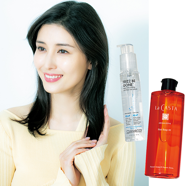 ヘアカラーは25歳からしていません。猫っ毛で軟らかいのでコシが出るラ・カスタの48番を愛用。20代前半は白髪があったのに自然と消失しました。ストレスを溜めないこと、頭皮の血行促進が大事だと実感。左・ドライヤー前に。ジョヴァンニ フリッズビーゴーン スムージング ヘアセラム ¥2,640(コスメキッチン)、右・ラ・カスタ ヘアソープ48 300ml ¥2,200(アルペンローゼ)