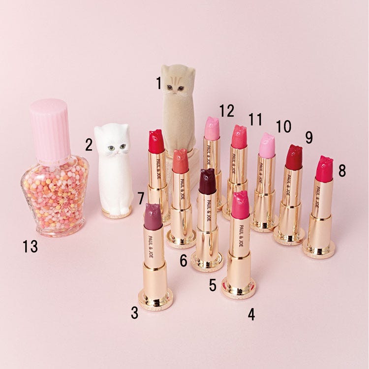 【1】ポール & ジョー アニバーサリー リップスティック ケース 002、【2】同 001 各1,980円(レフィル別売)、【3】ポール & ジョー アニバーサリー リップスティック 001「ボウタイブラウス」、【4】同 002「プレゼントリボン」、【5】同 003「秘密の扉」、【6】同 004「お茶目なリス」、【7】同 005「赤いスニーカー」、【8】同 006「ピンクの手帳」、【9】同 007「パプリカマリネ」、【10】同 008 「ライラックキャンディ」、【11】同 009「シュガーコンフェクショナリー」、【12】同 010「カルーセル ドゥ レーヴ」レフィル 各2,200円、【13】ポール & ジョー パール ファンデーション プライマー 005「ボナニヴェルセール!」 30ml 3,850円 /以上ポール & ジョー ボーテ(すべて限定発売)