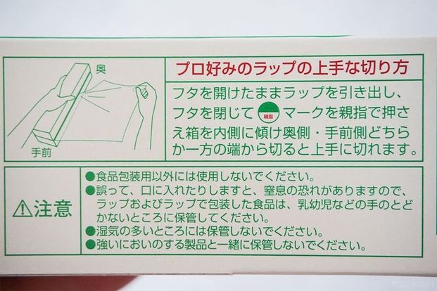 基本的な形は有名メーカーのラップと大差なく、箱に刃がついており、ふたを押さえながら刃でラップを切り取って使用します。
