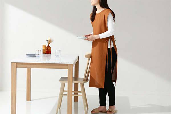「サイドリボン フルエプロン ブラウン」(税込3800円)は、とっても軽くて締め付け感がないから、長時間着ていてもラクちんなんだそう。