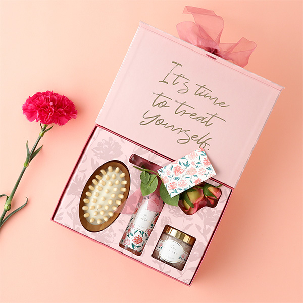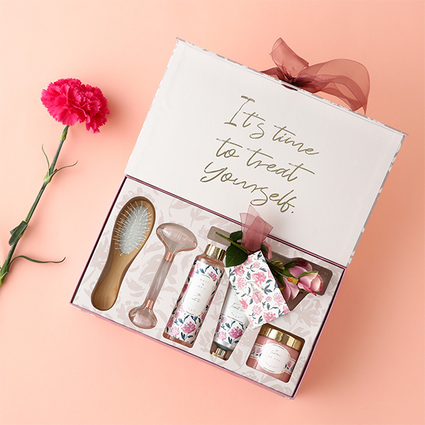 「ザ トリートタイム ギフトセット リラックス(ローズ&サボンの香り)」(税込3000円)は、ボディケアブラシやバスソルト、ヘア&ボディオイルといった癒しグッズに、メッセージカードと造花が付いたセットです。