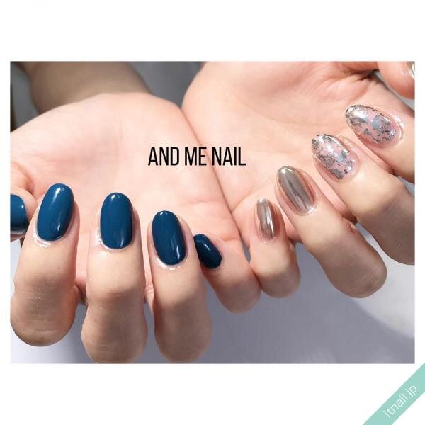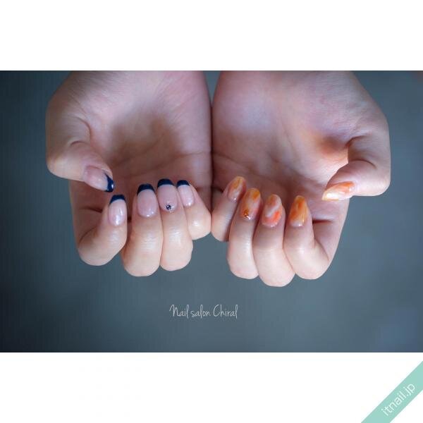 左右で異なる色やデザインにしたアシメネイルで、遊び心のある指先を楽しむのもおすすめ♪すっきりさせたネイビーのフレンチネイルと、ポップなオレンジネイルの対照的な組み合わせがネイルの存在感を引き出してくれていますね!