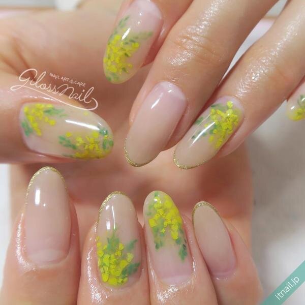 ミモザのモチーフは、シアーカラーネイルにアートするのもおすすめです。