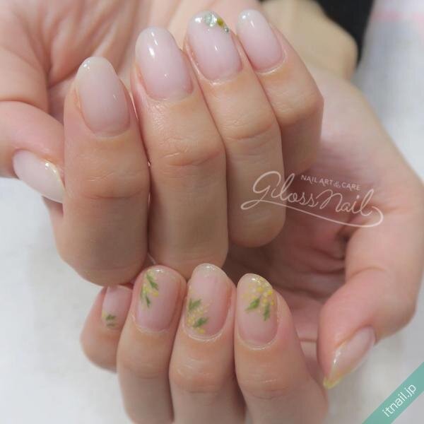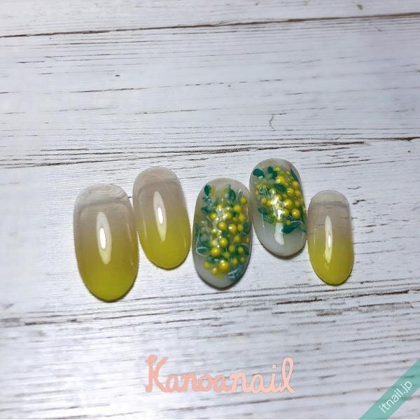 例えば、シアーな色味の淡いイエローグラデーションネイルをベースに、爪数本にミモザのモチーフを描くデザインはいかがでしょうか。ベースカラーとアートに使うカラーをイエローで統一することで、全体的にまとまりのある、お洒落度高めなネイルに仕上げられます。