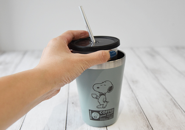 このカップコーヒータンブラーは真空断熱構造。そのため外側が熱くも冷たくもならないんです!これはうれしいポイントですね。