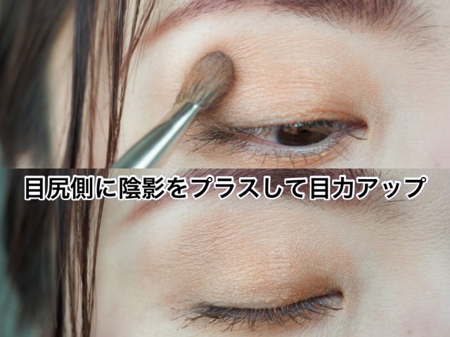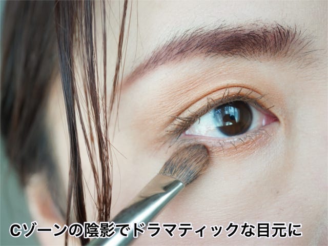 さらに、そのブラシを下まぶたの目尻にスライドさせ、目尻側1/3にそっと入れます。こうしてCゾーンにトープを塗ることで、ドラマティックな印象に変化します。