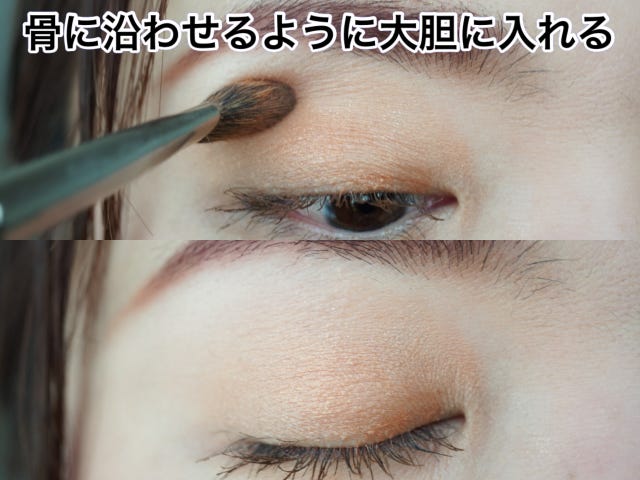 オレンジでまぶた全体を囲って血色と陰影を演出