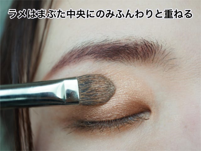 最後は輝きのトッピングを。クリアラメ(左上)をブラシにとり、まぶた中央にのせます。そして、ふんわりとしたタッチで左右に軽く動かしてください。