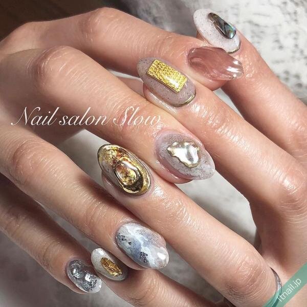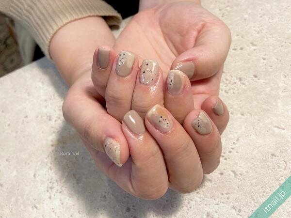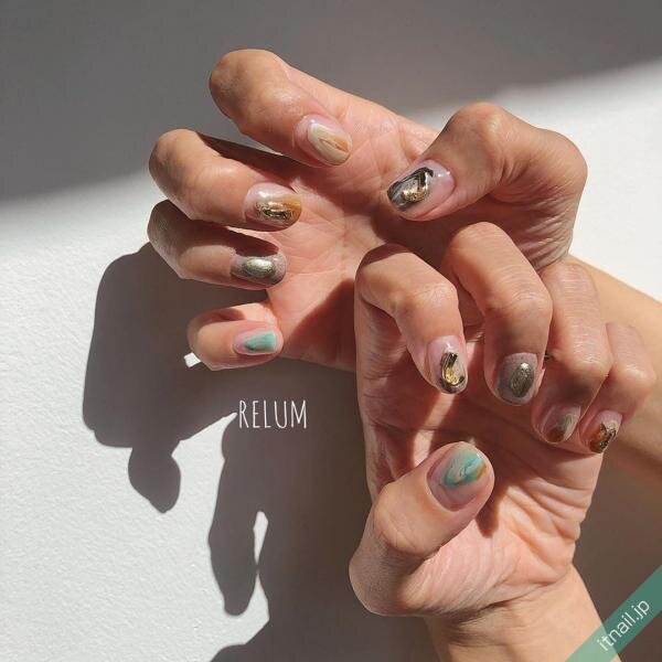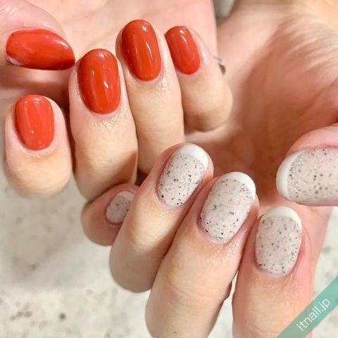 爪全体に入れたサンドネイルもおしゃれですが、塗りかけのようなランダムな入れ方をするのも人気♡もやもやしたデザインと組み合わせて、ニュアンスのある仕上がりにするとこなれ感のあるカジュアルネイルになりますよ!