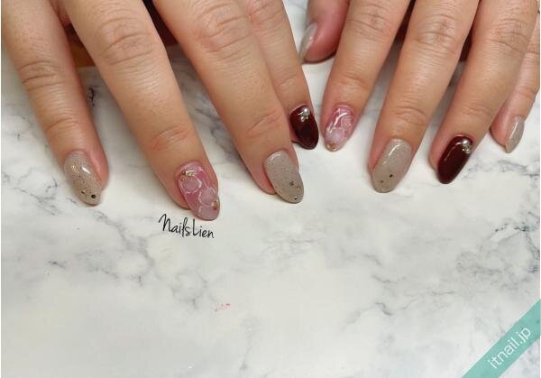 カジュアルさも可愛らしさも欲張りたいなら、サンドネイルとフラワーネイルで決まり!透け感のあるお花が女性らしくて可愛いですが、グレーのサンドネイルが落ち着いた印象を与えてくれますよ♡