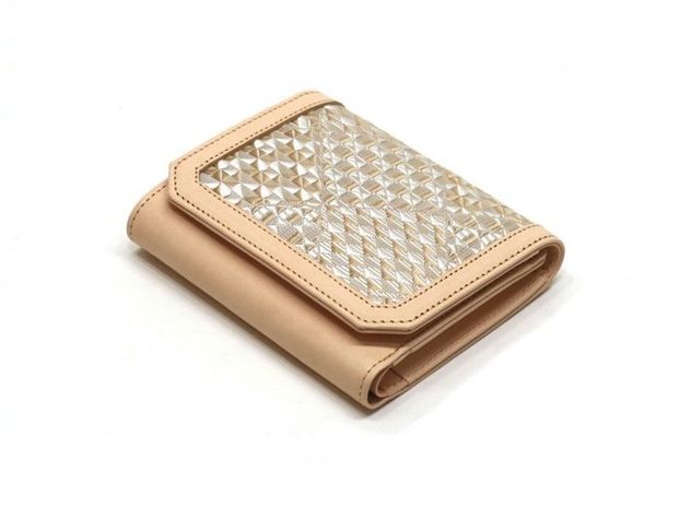 福岡の博多に伝わる博多織は、たくさんの経糸(たていと)に、細い糸を数本まとめてできた太い緯糸(よこいと)を打ち込んで作られる絹織物。この財布には、そのなかでも密で張りがあり、厚みも出る「琥珀織」が採用されています。凹凸のある幾何学模様は角度によって表情が変わり、見ていて飽きることがありません。