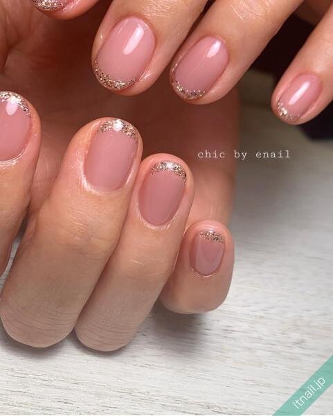 例えば、お好みの色味のピンクでベースカラーを塗ったネイルに、ゴールドラメのスキニーフレンチアートを重ねるデザインはいかがでしょうか。ピンク色でカラーリングしたネイルの爪先にラメラインを描くだけで完成しますので、セルフでも簡単にアートできますよ♪