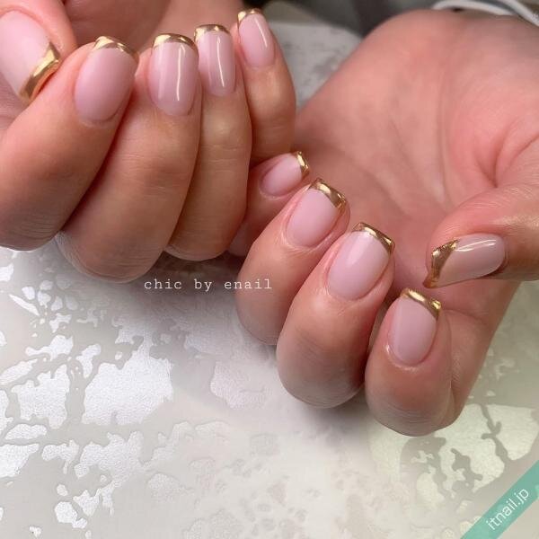 一般的なフレンチネイルに比べて、フレンチ部分がかなり細い、スキニーフレンチネイル。最初にご紹介するのは、ピンクネイルにゴールドでアートする、スキニーフレンチデザインです。