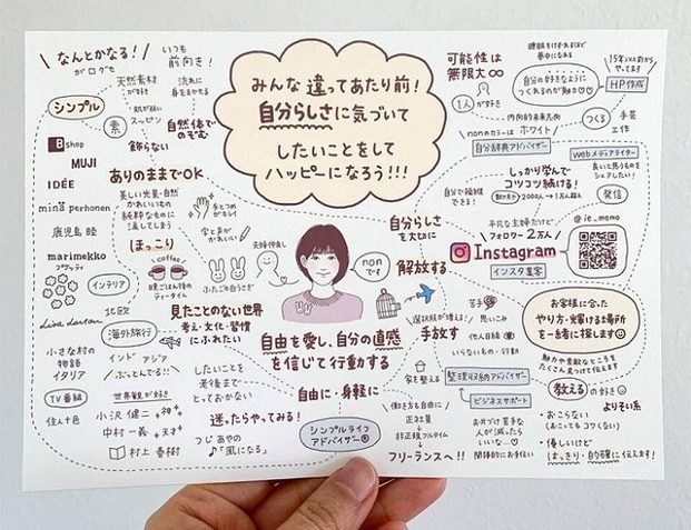 すどうちかさんは、空間や思考の整理をサポートする「ライフオーガナイザー」の資格をもつデザイナーです。フリーランスで働く女性から話を聞き、その人の性格や仕事内容などをイラストと文字で表したツール「自己紹介マップ」などを作るサービスを行っています。