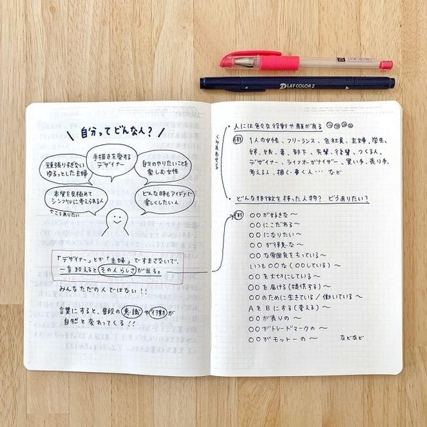 すどうさんがこのノートを書いた頃、ご自身のキャッチコピーとして考えたのは、「手描きを愛するデザイナー」。みなさんも、「どんな時もアイデアで楽しくしたい人」「頑張りすぎないゆるっとした主婦」など、自分のものを考えてみてほしいと言います。