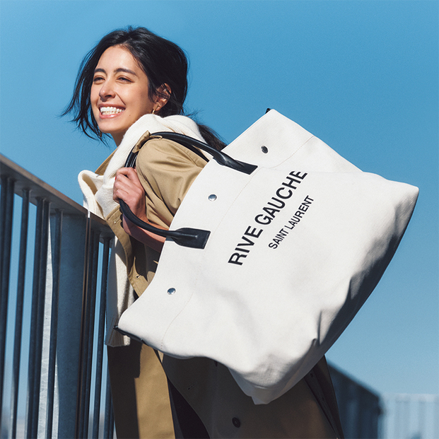バッグ〈H40×W60×D26㎝〉[2300g]¥218,900 トレンチコート¥302,500 肩にかけたニット¥154,000 ピアス¥82,500(すべてサンローラン バイ アンソニー・ヴァカレロ/サンローラン クライアントサービス)