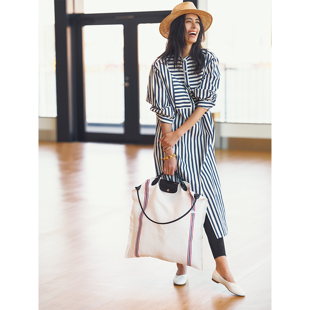 バッグ〈H52×W53㎝〉[416g](編集部調べ)¥22,000(ロンシャン/ロンシャン・ジャパン)シャツワンピース¥28,600(ユナイテッドアローズ/ユナイテッドアローズ 有楽町店)パンツ¥60,500(サードマガジン)シューズ¥28,600(ファビオ ルスコーニ/ファビオ ルスコーニ ルミネ有楽町店)ハット¥14,850(CA4LA/CA4LA プレスルーム)メガネ¥28,600(アイヴァン/アイヴァン 東京ギャラリー)ブレスレット¥34,650(エリオポール/エリオポール代官山)