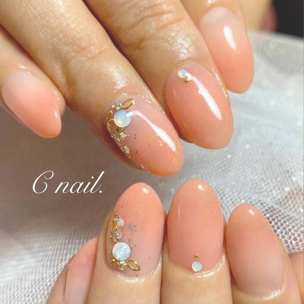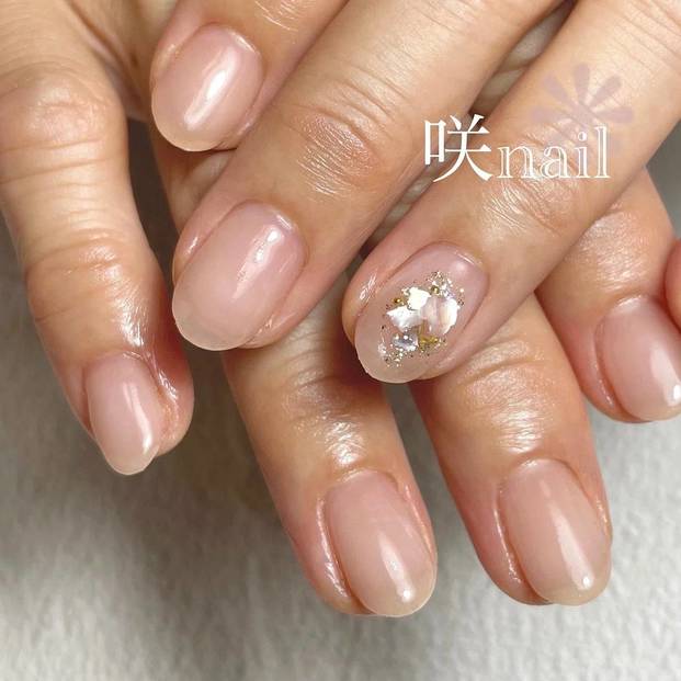ヘルシーなピンク系ネイルに、大きめのシェルで初夏らしい輝きプラスすれば、老けて見えない手元の完成です♪