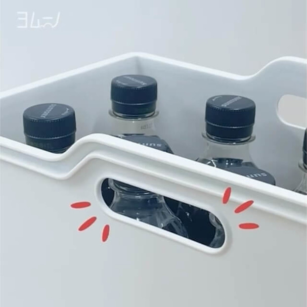 サイドにも持ち手用の穴が空いているので、多少重い物を入れても収納場所に持っていきやすくなっています。