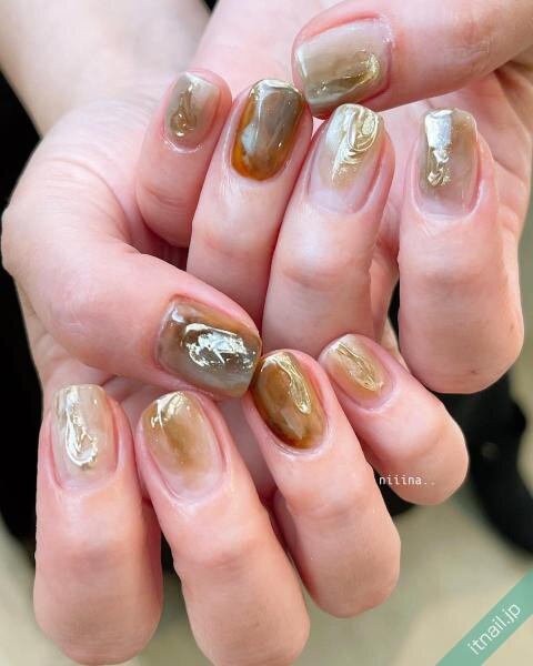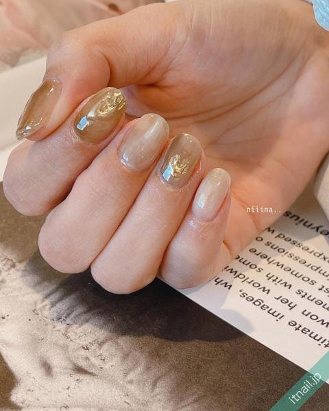 例えば、落ち着いた色味で統一した大人な雰囲気のニュアンスネイルに、ゴールドのミラーアートを重ねるデザインはいかがでしょうか。ブラウンやライトブラウン、ベージュといった色味でアートしたニュアンスネイルにゴールドのミラーアートを重ねれば、上品なデザインにほどよい輝きがプラスされた素敵なネイルを楽しめます。
