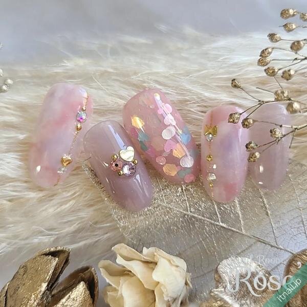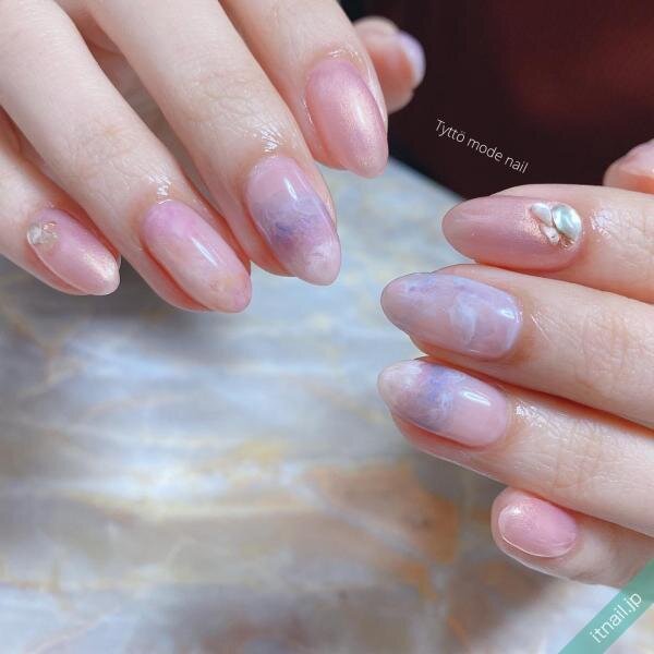 シアーで淡いピンクネイルを多めに使いながら、パープルをメインにした天然石ネイルをワンポイントにオン♡統一感がありながらも、1色だけ違う色やデザインになっているのでこなれ感があります。