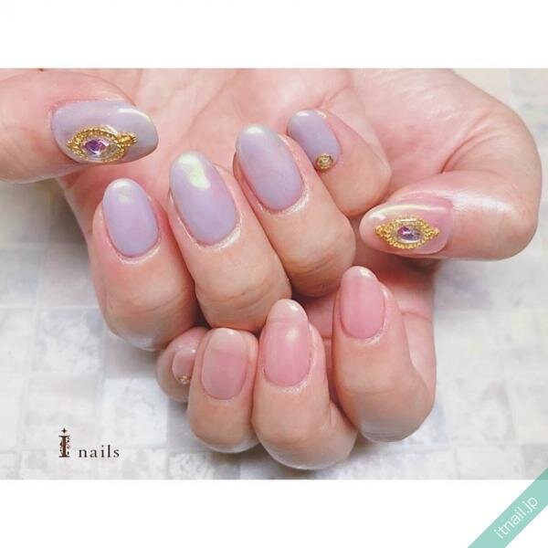 エレガントな印象が強くなるゴールドミラーを使う場合は、細めのラインを意識するのがおすすめです。そうすることで、淡いピンクとパープルの柔らかさを壊さずに、おしゃれなデザインにすることができますよ♡