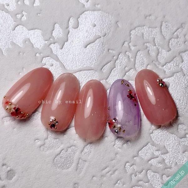 ひとつだけ違う色で塗ったネイルデザインは、セルフでもチャレンジしやすい王道のデザインです。可愛らしいピンク系の暖色ネイルの中に、パープルなど落ち着いた色を入れるだけで大人かわいいネイルになりますよ♡