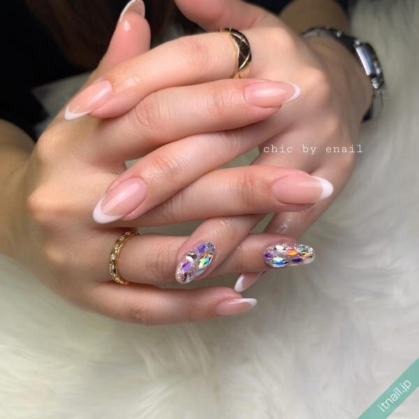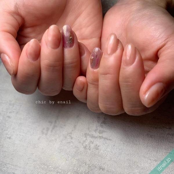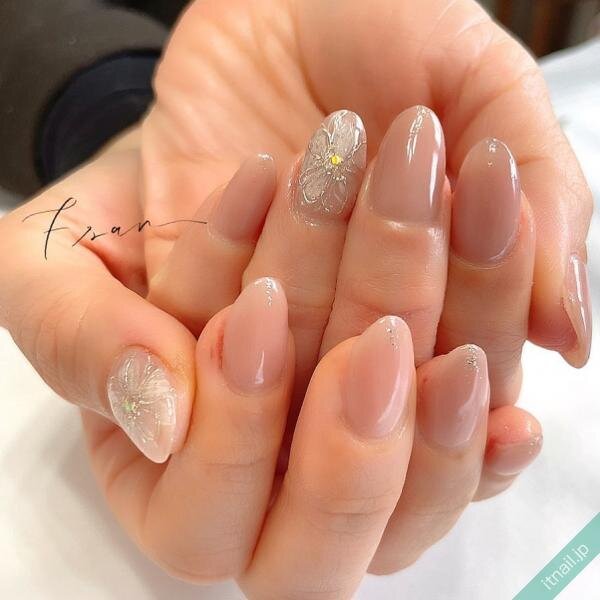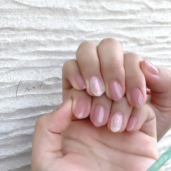 ピンクベージュのような肌馴染みの良いネイルには、アクセントになるネイルデザインをワンポイントにオン♪ホワイトベースのオーロラネイルなら、上品な輝きが楽しめるのでおすすめです。