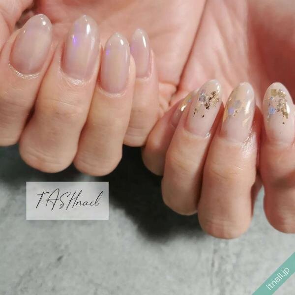 シェルをワンポイントにのせて、爽やかなアシメネイルにするのもおすすめです。ベージュ系をベースに、爪の先端や根元にのせるだけで、ナチュラルで可愛いアシメネイルになります。オフィスネイルにもおすすめ!