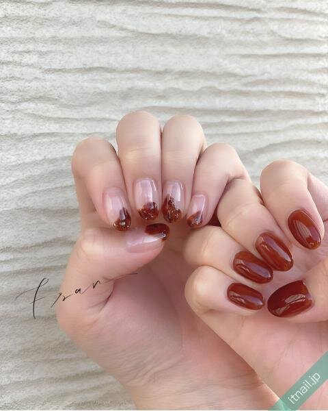 同じ色を使いながら、左右の爪で違う取り入れ方をするのも、統一感のあるアシメネイルになるのでチャレンジしやすいです。シンプルに爪全体に塗ったブラウンネイルと、塗りかけのようにした抜け感のあるブラウンネイルで、おしゃれ度アップ♡