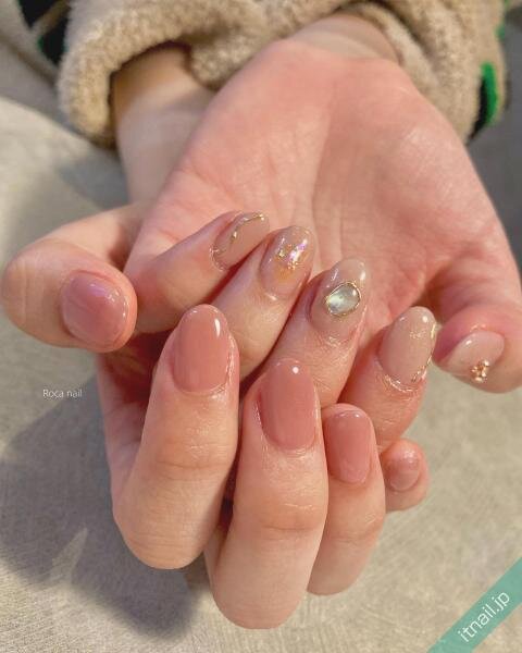 片方だけにデザインをプラスして、少し遊び心のあるアシメネイルにするのもおすすめ♪肌馴染みの良いヌーディーカラーをベースにすることがポイントです。砂ジェルネイルのようなカジュアルなネイルがこれからの季節に人気!