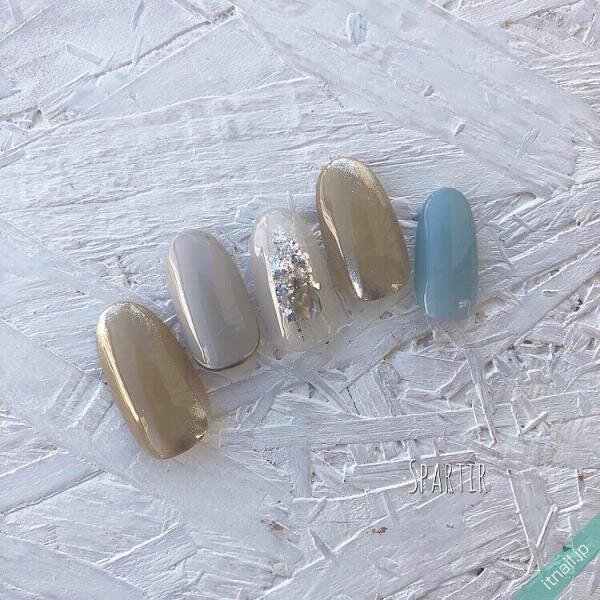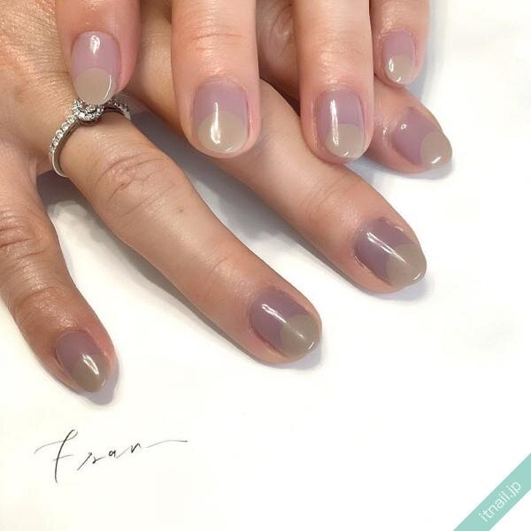 手元になじんでナチュラルな見た目を叶えてくれるくすみベージュは、アシンメトリースタイルでこなれ感をプラスするのも素敵です。左右どちらにもシアーな色味をもってくれば、涼し気な雰囲気がますます際立ちますよ。