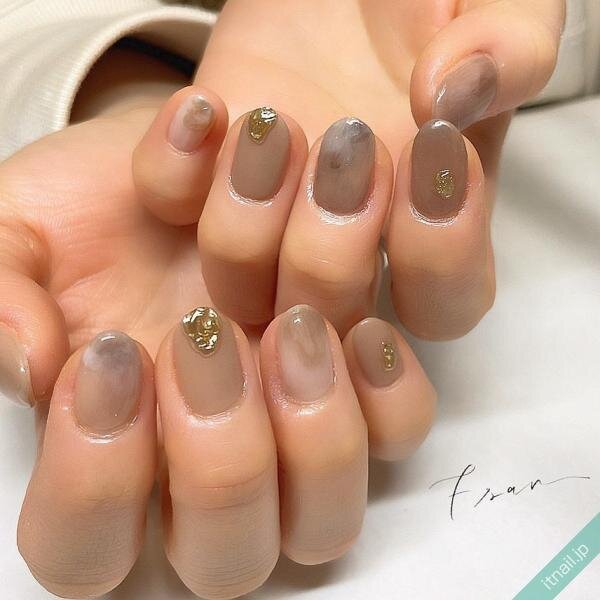 大人っぽく落ち着いた印象を楽しみたいときは、くすみベージュを取り入れるのが正解!ニュアンス感を混じえたミックスネイルデザインは、アンニュイかつスタイリッシュです。シックな色合わせだからこそ、ぷっくり立体的にのせたゴールドのデコレーションも映えていますね。