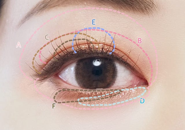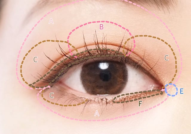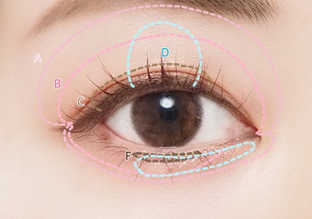 ① Aをアイホール全体から眉下まで広げる。下まぶた全体にものせる。