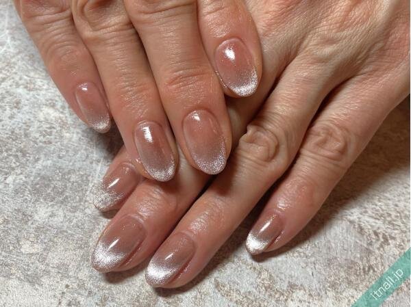 マグネットの光を爪先に集め、フレンチネイルのように仕上げたデザイン。爪全体がギラギラしないので上品な仕上がりになっています。ちゅるんとした可愛らしさと大人のかっこよさが融合したデザイン。オフィスネイルにも最適です。