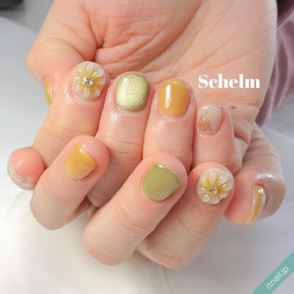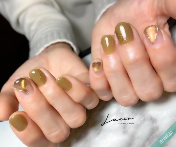 こちらはさりげなくマグネットジェルを使用したデザインです。くすみグリーンが大人な印象に仕上げ、ニュアンス感あるマグネットジェルがトレンドを抑えた指先に。ショートネイルなので、優しく可愛らしいイメージにも仕上がります。